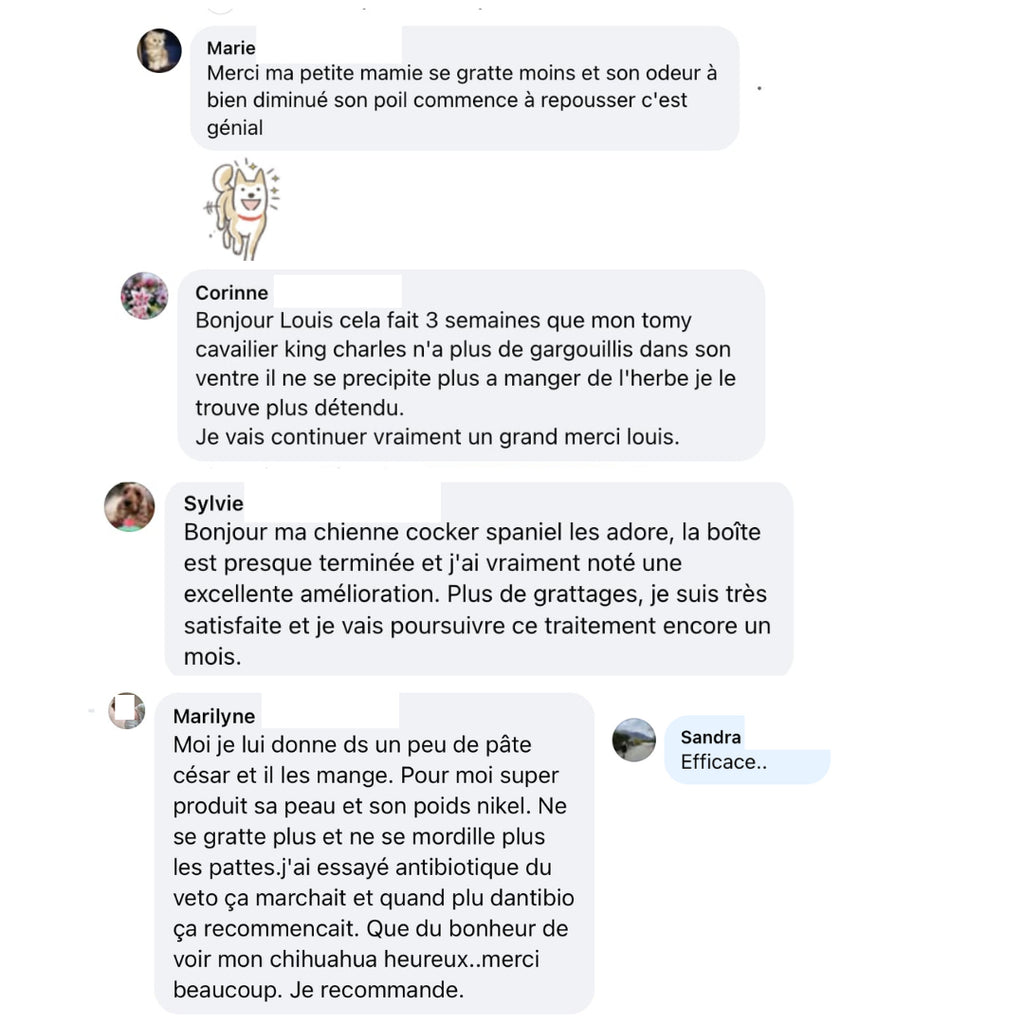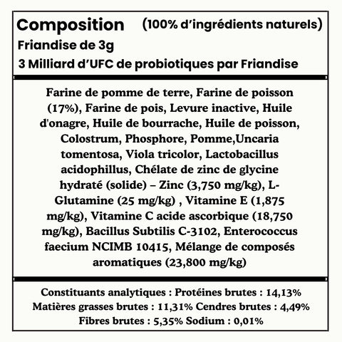 Ces ingrédients nous permettent de rajouter du goût, de la texture ainsi que certaines propriétés anti-inflammatoires afin de garantir que votre chien appréciera nos friandises et qu'elles auront des effets bénéfiques sur lui. ❤️